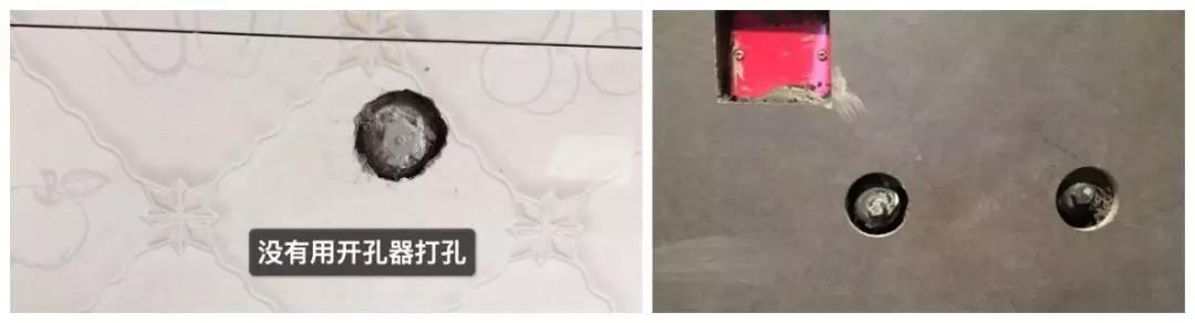 ● 水管的開孔處理:瓷磚鋪好會在上面開孔,但是師傅一般都會用比較粗暴的方法,這樣開出來的孔彎彎曲曲;所以開孔的時候你和師傅說一下,用開孔器,他就明白了,這樣開出來的孔整齊美觀。